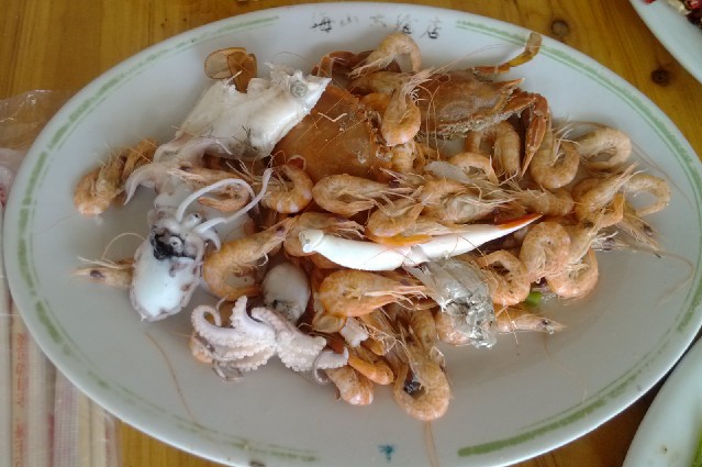 第二天午餐我们在一家小农家餐馆吃的,值得一提的是,,这里有一道特别的菜----我们自已打的海鲜。大家尝到了正真的海鲜-----原滋原味,有鲜又嫩。果然味道好极了!让我们个个回味无穷.