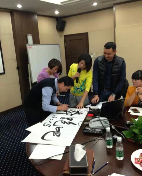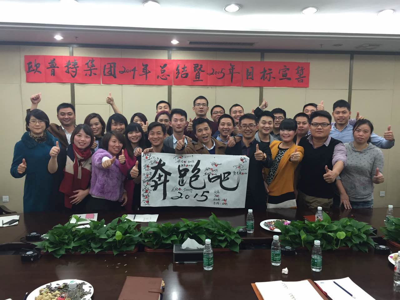 激动人心的目标宣誓环节终于来了,在激昂雄壮的音乐下,首先由光电一部郑经理签字画押了1200万的个人业绩承诺,然后每一个同事都签下了自己的目标,并按上了一个个鲜红的手指印,宣读自己豪迈的承诺-----有承诺未完成目标裸奔的,也有承诺完成任务后请大家宝利来旋转餐厅自助餐的。2015年大家都在努力逼自己改变,去实现自己更远大的梦想。几十个兄弟姐妹的梦想就像一条条娟娟溪流汇成大海,凝聚成欧普特集团2015年营销战略,由苏立辉挥毫泼墨取名“奔跑吧2015”。