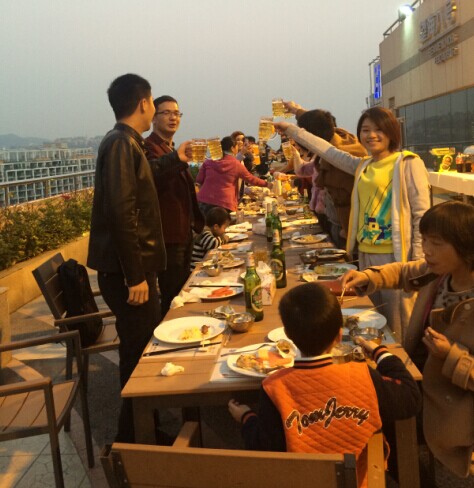 会议结束后,在徐徐海风中,在美丽望海八号露天烧烤场,我们尽情的品尝名家大厨为我们精心准备的烧烤,喝着丰收后的喜酒,独享这片深圳最美丽海边山腰,感觉超赞。天色渐渐暗淡下来,远远望去,大海和山脉海山一色,浑然一体就像我们营销中心大家庭,销售部小伙子是雄伟的大山,商务部的美女们就是辽阔的大海,两部门之间相互激励,超越梦想。
